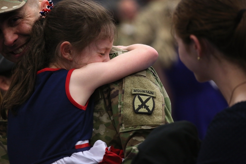 当地时间2016年5月17日,美国纽约,一个小女孩紧紧拥抱从伊拉克归来的父亲。据报道,此次共计1000多名美军士兵从伊拉克撤退回国。他们于9个月前前往伊拉克协助打击“伊斯兰国”。 视觉中国