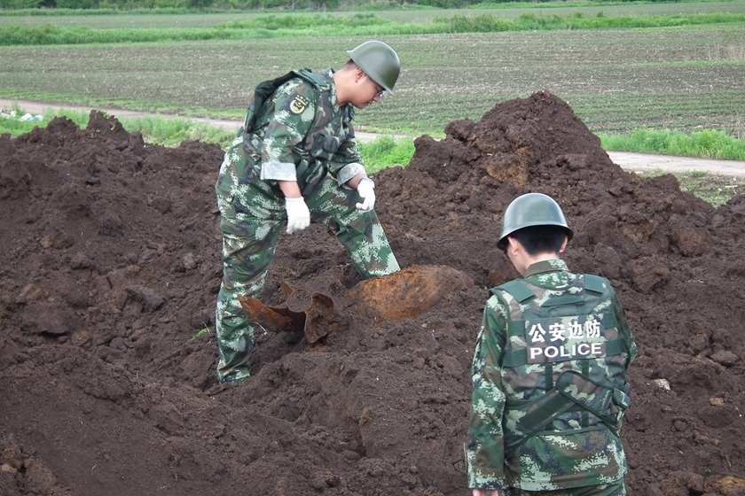 2016年6月14日,黑龙江黑河,黑河公安边防支队孙吴大队清溪边防派出所官兵正在现场处理炸弹。上午9时5分,黑河市孙吴县居民苗某在清溪村西菌厂边用挖掘机生产作业时,突然挖出一枚炮弹,重达300斤。 视觉中国