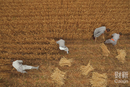 农场工人郑师傅在地头吃午饭,因为收割机打下的粮食尚未装车运走,因此他要留在地里看护。 图/财新记者 陈亮