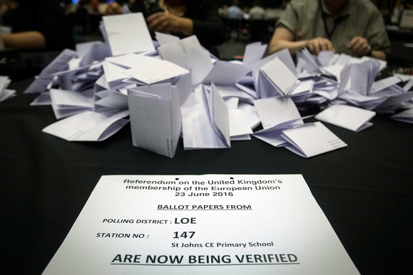 当地时间2016年6月23日,英国贝尔法斯特,英国脱欧公投计票工作进行中,工作人员等待选票。 视觉中国