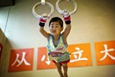 2014年8月29日,安徽省阜阳市体校体操队,一名孩子在平衡木上练习动作。在安徽省阜阳市体校体操队有十多名4岁至9岁的孩子在练体操。这个体操队从1992年成立以来,先后为省和国家体操队输送队员几十名。两届奥运冠军邓琳琳就是从这个体操队走出来。