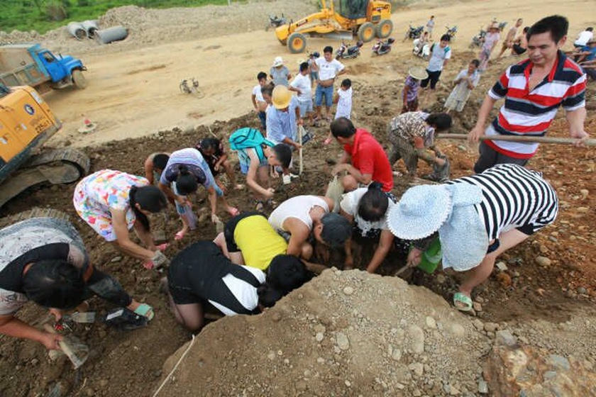 2016年8月20日下午3时许,湖南常德,柳叶大道西延线的工地上发现了不少古钱,在一处立交桥西边的护坡上,云集了几十位村民,他们带着各式工具不停的挖掘翻找。 视觉中国