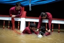 当地时间2016年9月19日,泰国大城府,潜水员在沉船附近搜救。当地时间2016年9月18日,一艘载有约150人的船只在泰国湄南河大城府河段发生倾覆,已致18人死亡。 编辑:杜广磊 图/视觉中国