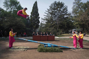朝鲜第13届人民体育大会举行,选手参加跷跷板项目。 视觉中国