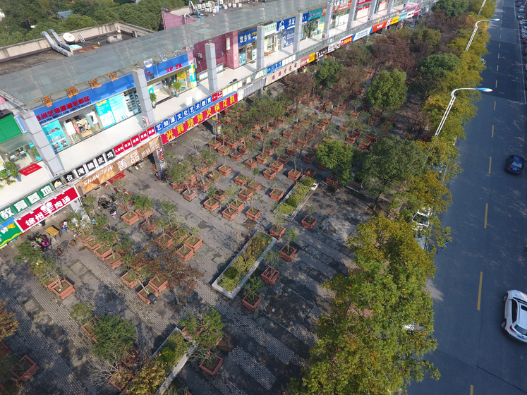2016年11月24日,江苏苏州,钟慧路一段长约40米的开阔人行道上放置了419个大型树箱,种满了桂花树。这些盆栽是城管部门为遏制沿街店铺占道经营而设置的,盆栽间隔很小,不影响市民走路,但能有效防止占道经营行为。 东方IC