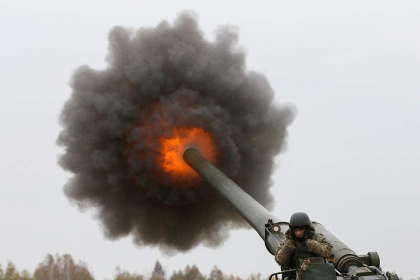 - 当地时间2016年10月21日,乌克兰基辅,乌克兰军队举行军事演习,军人点燃榴弹炮现场硝烟滚滚。 图自视觉中国