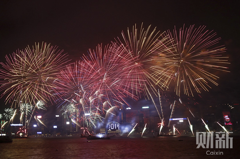 2017年1月1日,香港维多利亚港“烟花音乐汇演”现场,烟花、烟火、灯光以及音乐将在著名地标的衬托下,于维多利亚港上空交织绽放,共同迎接2017年的到来。 图/财新记者 夏伟聪