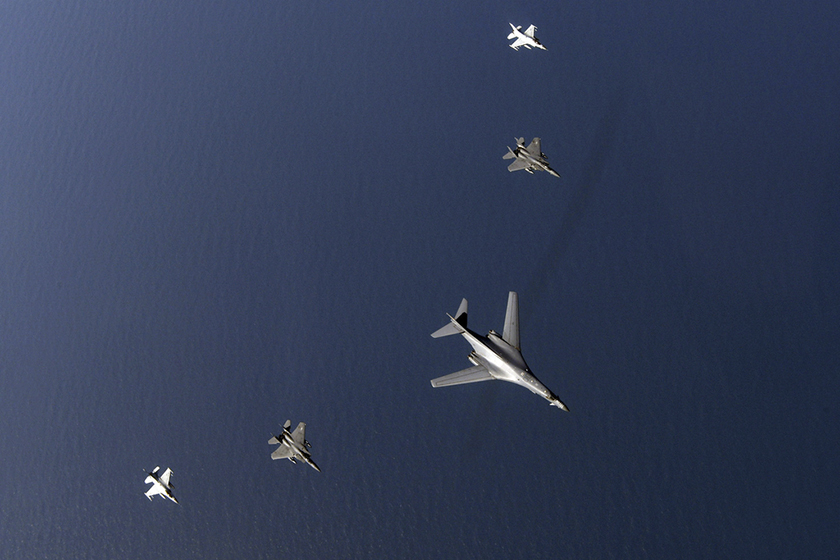 当地时间2017年3月22日,美军B-1B战略轰炸机参与军事演练后现身朝鲜半岛上空。东方ic