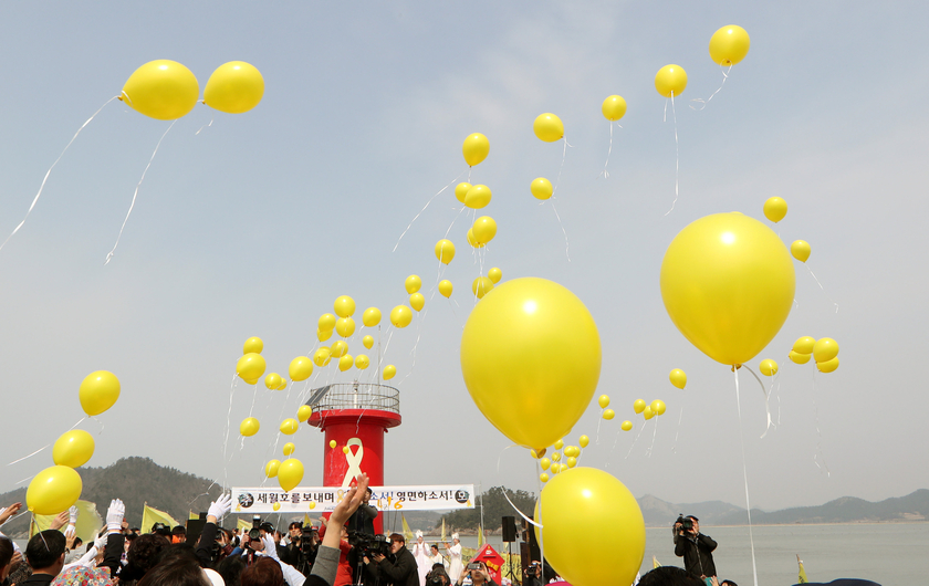 韩国民众悼念“世越”号遇难者 港口放飞黄气球