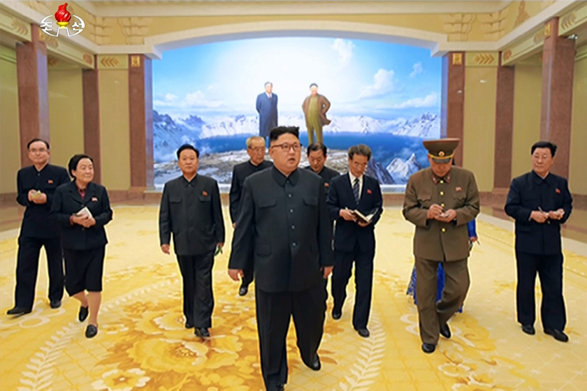 朝鲜最高领导人金正恩视察新改建的朝鲜革命博物馆。