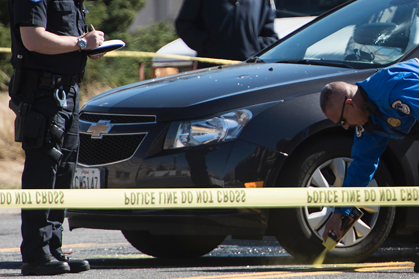 警方没有透露嫌疑人性别,但当地媒体拍摄的照片显示,事发地区有一名女子被押上警车,现场一辆警车后窗玻璃被撞碎,但没有人在事件中受伤。视觉中国
