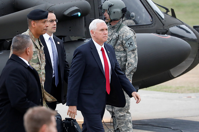 当地时间2017年4月17日,韩国坡州板门店附近,美国副总统彭斯访问朝韩非军事地区。