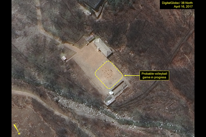 2017年4月20日讯,美国专门监测朝鲜动态的网站北纬38度指出,4月16日的卫星图像显示,朝鲜没有准备核试的迹象,只看到试验场的人员在打排球。视觉中国