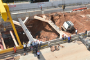 据深圳市公安消防支队通报,5月11日11时许,深圳市福田保税区深福保大厦对面地铁3号线延长线工地局部坍塌。据了解,地铁上方一泥头车作业时发生地面坍塌,称有3名工人被困。图为救援现场,泥头车被埋在地下。 东方IC