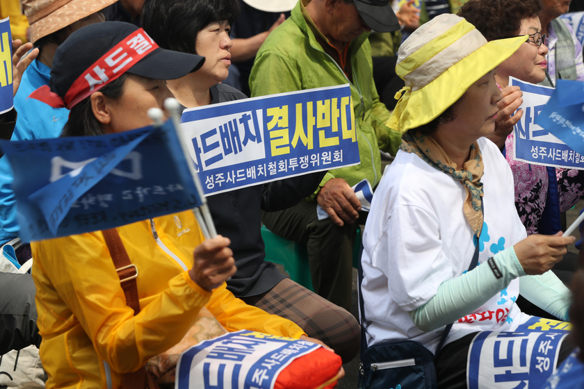 当地时间2017年6月7日,韩国庆尚北道星州郡,韩国民众举行反“萨德”集会,要求取消部署。据韩联社消息,韩国总统府青瓦台在6月7日下午宣布,韩美军方在半岛东南部进行的“萨德”反导系统部署作业即刻暂停。此外,青瓦台还要求,“萨德”反导系统的部署,需要先经过全面的环境评估流程。当被问及这一流程会持续多久时,青瓦台官员称,可能会长达一年。图/东方IC