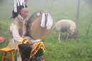 2008年8月,汶川夕格老寨子,孔武有力的男子们在跳羌族祭祀舞蹈羊皮鼓舞。