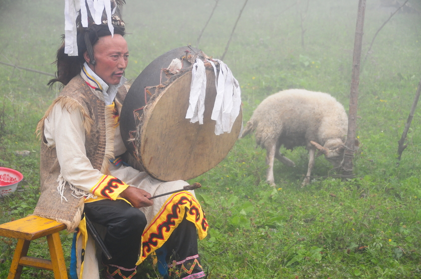 下雨天,杨贵生坐在自家的院子里发呆,和大多数普通老头无异。杨贵生经常回忆往昔,最风光的一回,2006年汶川县政府在萝卜寨举办羌族文化旅游节,开场舞祭祀,杨贵生站在高高的祭台上,手敲响羊皮鼓,数百名群众舞蹈演员跟着鼓的韵律摆动。那一刻,他眯着眼睛,唱着古羌语经文,鼓点越敲越快,“神降临在我身上。我不是在表演,我是在与神对话。”