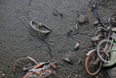2017年7月16日,上海,近日由于龙珠港桥所跨的大场浦河疏浚清污,河流水位降低,附近居民发现,河水降低后,水面下的“秘密”浮现出来——十余辆共享单车不知被何人扔入河中,直插淤泥之中。视觉中国