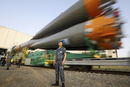 当地时间2017年7月26日,哈萨克斯坦拜科努尔,联合号MS-05宇宙飞船由联合号FG火箭助推器推进,被送往拜科努尔太空中心发射台。联合号MS-05宇宙飞船将于7月28日发射至国际空间站,届时将有美国宇航员Randolph Bresnik和意大利宇航员Paolo Nespoli完成此次太空飞行任务。视觉中国
