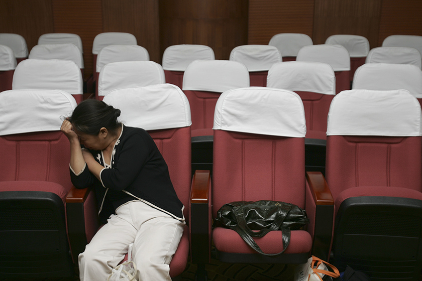 2009年12月,已加入传销团伙的刘斌,将父母骗入传销虎穴。当时其母张立平以身体不好为由,并谎称已接受传销理念,最后在刘斌的陪同下回老家。留在传销窝点的父亲刘福全因拒绝参与传销活动并要求离开,结果被殴致死。图为刘斌等七人传销案庭审前张立平已泣不成声。视觉中国