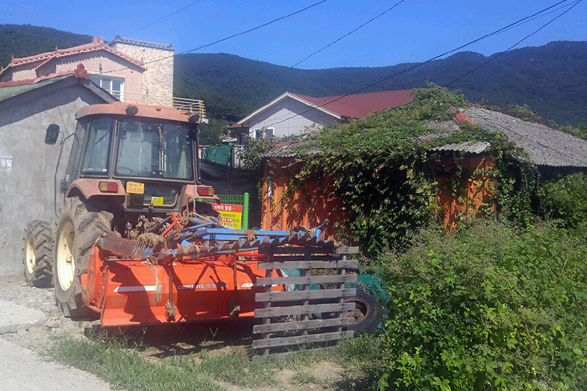 2017年9月13日讯,韩国巨济市,文在寅故居入口被拖拉机堵住。图/视觉中国