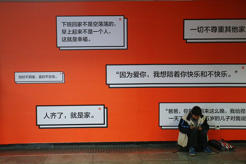 2017年10月11日,四川成都,地铁一号线人民北路站一通道,橙红色的墙壁上写着许多充满温情的家庭对话,其中一些是爸爸妈妈对远在他乡儿女的关心问候牵挂,看着让人暖心又催人泪下。东方ic
