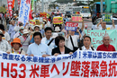 当地时间2017年10月12日,日本冲绳县,美军一架CH-53大型运输直升机10月11日在冲绳本岛北部的美军北部训练场附近坠落,该事件引发当地村民抗议。东方ic
