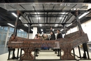 2018年1月8日,四川省成都市金沙遗址博物馆,工作人员从成都商业街船棺葬发掘的文物中复原出最早最完整的B型漆床,一共有四十五个零件,最长零件三米二,最小二十厘米,布满龙纹。图/成都商报 王勤/视觉中国