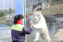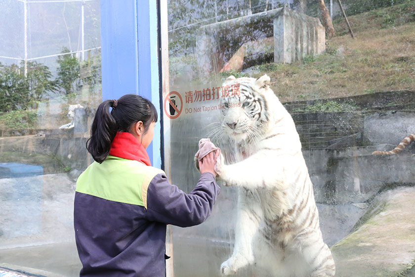 2018年1月8日,重庆永川的乐和乐都野生动物世界,饲养员给白虎户外展馆擦玻璃的时候,无意之中却引来一头白虎跟随效仿,它看到饲养员擦玻璃,它也立起身来用前爪对着饲养员擦玻璃。图/视觉中国