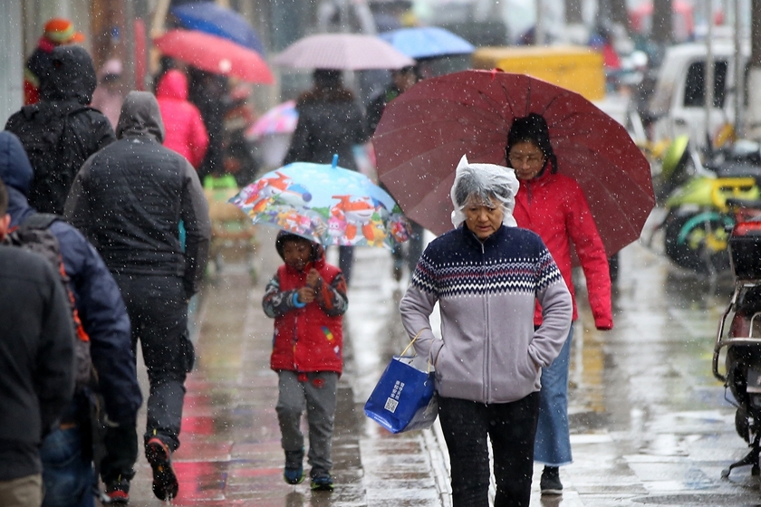2018年4月4日,北京,冷空气来袭气温骤降,北京迎来“四月雪”,民众撑伞出行。图/视觉中国