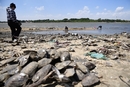 2018年5月23日,哈尔滨,民众捡拾河蚌。从5月19日开始,大顶子山航电枢纽已将负责泄流的5台发电机组减为2台,大幅度减缓泄流量,5月21日松花江哈尔滨城区段水位已比5月20日上升了1厘米。随着大顶子山航电枢纽剩余的两台发电机组陆续关闭,松花江水位也将慢慢回升至114米以上。图/视觉中国