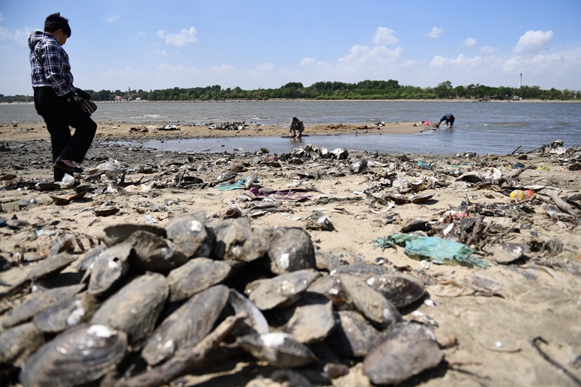 2018年5月23日,哈尔滨,松花江哈尔滨段水位今春持续走低,河床裸露,河蚌堆积。哈尔滨水文专家解释,松花江水位今春之所以出现自2007年以来的最低值,一是松花江流域超过30天缺少有效降雨,二是大顶子山航电枢纽为了保证下游农田灌溉,加大了放流。图/视觉中国