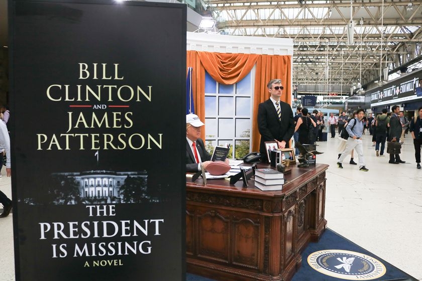 当地时间2018年6月4日,英国伦敦,一名演员装扮成美国总统特朗普的样子,在英国伦敦滑铁卢车站内的“椭圆形办公室”办公,并手拿美国前总统比尔·克林顿的新书《总统失踪》进行宣传。图/视觉中国