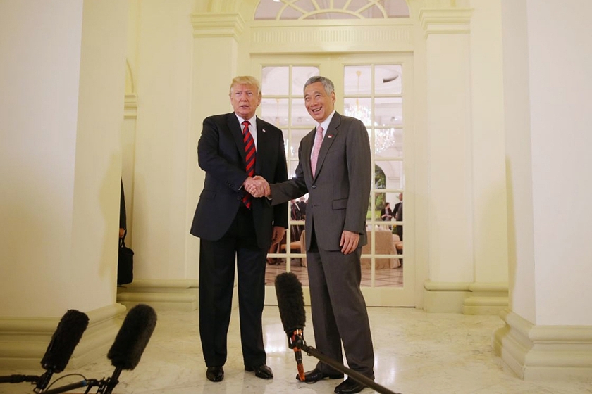 当地时间2018年6月11日,新加坡,新加坡总理李显龙会见美国总统特朗普。报道称,特朗普当天上午约11时45分从香格里拉大酒店出发,前往总统府与李显龙会面。特朗普对新加坡的热情款待、专业精神和友谊表示感谢。图/视觉中国