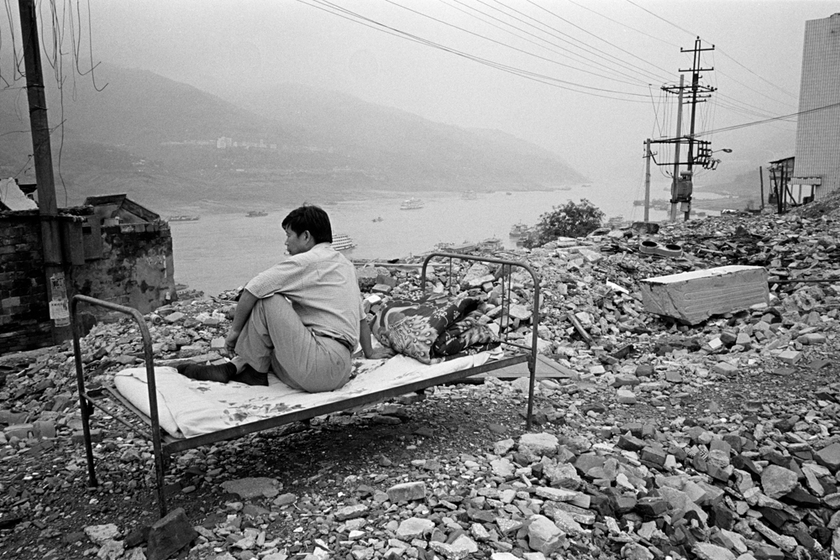 2002年9月21日,重庆奉节老城,一男子坐在废墟上的单人床上,旁边是待拆迁的清静庵。 图/王景春
