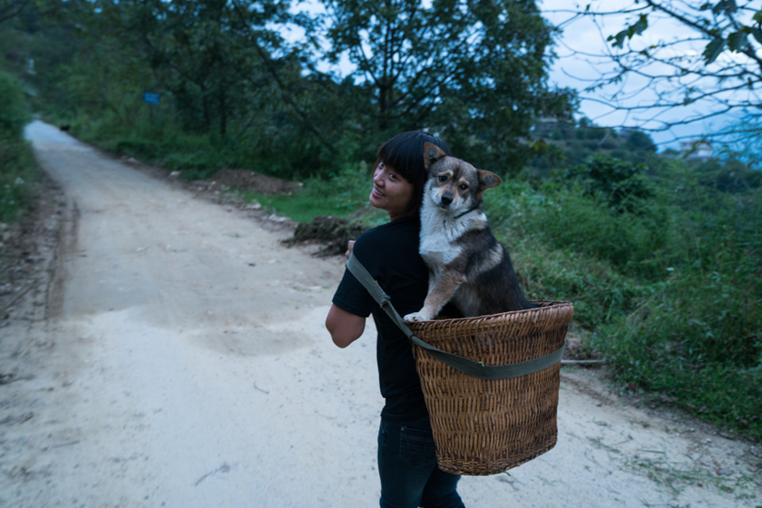 2016年9月24日,云南怒江州福贡县知子洛,背着小狗散步的女孩。 图/郭现中