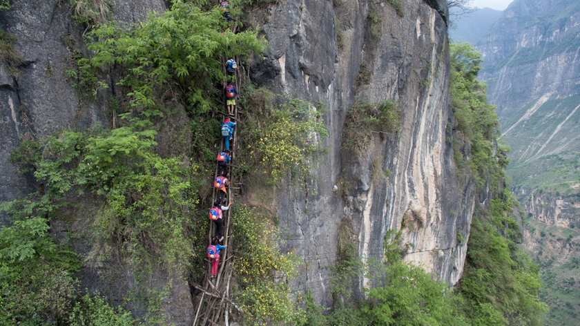 四川省凉山彝族自治州昭觉县支尔莫乡阿土勒尔村,位于海拔1400多米的悬崖上,与山下公路垂直距离约800米。顺着悬崖断续修建的17条藤梯是村里通向外界的“道路”,村里的15个孩子要靠徒手攀爬,才能到山下的小学读书。 图/陈杰