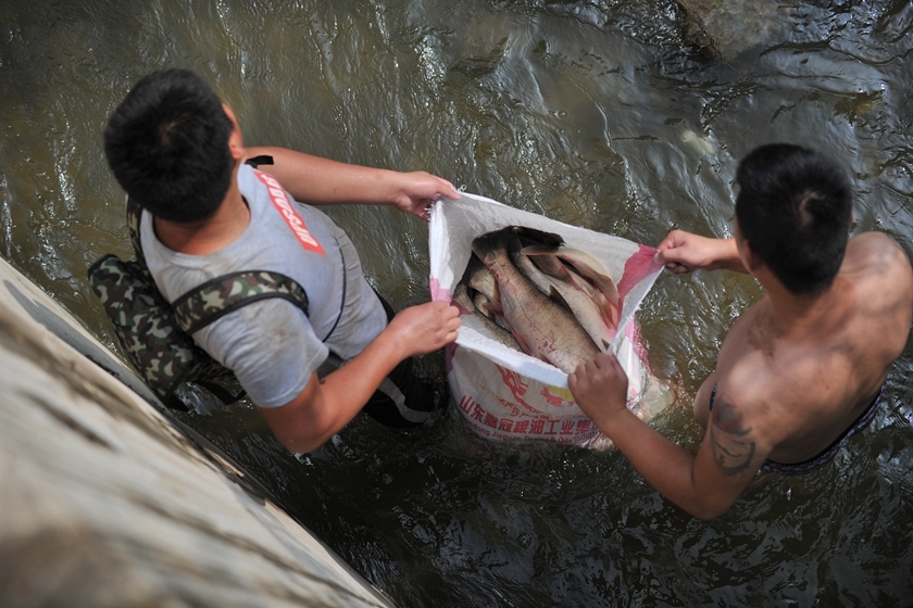2018年7月15日消息,太原,在滨河东路祥云桥下,一些市民站在河中橡皮坝下,进行了一场捕鱼大战。图/视觉中国