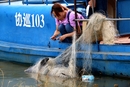 2018年8月1日,江西九江濂溪区鄱阳湖水域,护豚队将一头死亡江豚运至岸边,该头成年雄性江豚浑身被丝网缠住,无法动弹,最终被困死在网中。7月24日,农业农村部公布长江江豚数量仅剩约1012头,正申报国务院希望将“水中大熊猫”升级为一级保护动物。图/视觉中国