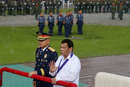 当地时间2018年8月8日,菲律宾奎松市,菲律宾举行活动纪念菲律宾警察部门成立117周年,杜特尔特在雨中检阅警察。图/东方IC