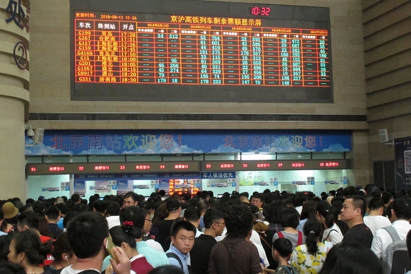 2018年8月13日,北京,大批旅客在北京南站。受设备故障影响,京沪高铁多趟列车延误、停运,旅客滞留北京南站。图/视觉中国
