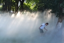 2018年8月15日清晨,重庆南滨公园,从公园喷雾旁走过的民众。浅白色水雾弥漫开来如人间仙境。图/视觉中国