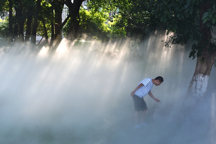 重庆公园推广喷雾降温 市民雾里出行入“仙境”