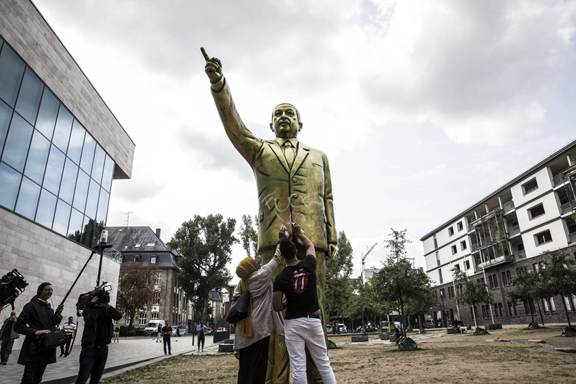 埃尔多安金色雕像亮相德国双年展 遭抗议者涂鸦