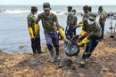 当地时间2018年9月10日,斯里兰卡首都科伦坡北部城镇Uswetakeiyawa,士兵们在事故海岸清理漏油。在图/视觉中国