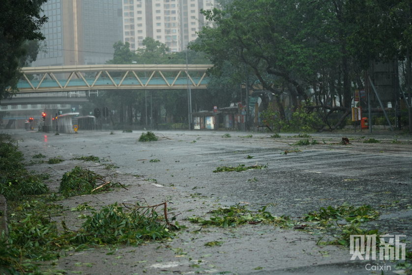 2018年9月16日,香港大坑,超强台风“山竹”来袭,被狂风折断的树枝散落在地面上。预计,“山竹”将以每小时30公里左右的速度向西偏北方向移动,将于16日下午到晚上在广东珠海到吴川一带沿海登陆(14-15级,42-50米/秒,强台风级),登陆后将继续向西偏北方向移动,强度逐渐减弱。 图/财新记者 梁莹菲