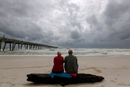 当地时间2018年10月9日,美国佛罗里达州,飓风“迈克尔”即将登陆。在海边,盖奇一家人坐在皮卡车后面等待着飓风“迈克尔”登陆。图/视觉中国