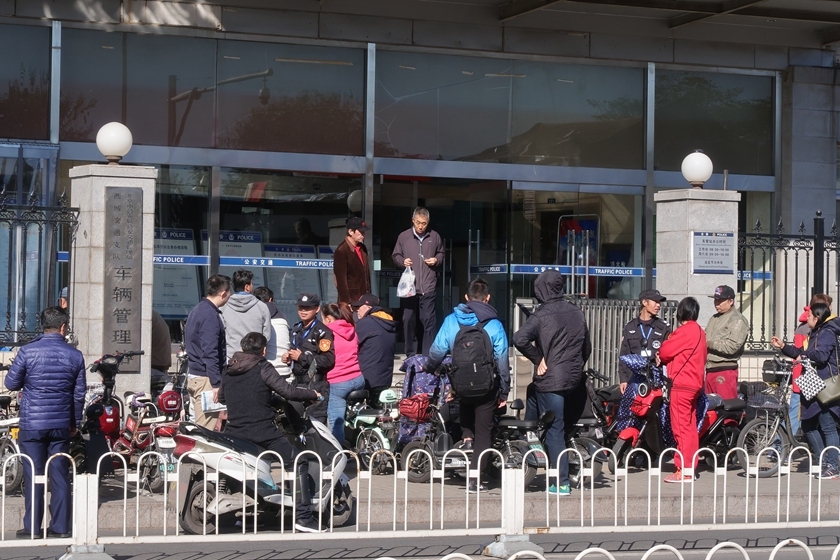 2018年10月11日,北京,市民排队等待给电动车登记牌照。交管部门提示,无论是登记挂牌,还是为“合格产品目录”外的电动自行车领取临时标识,都将从下月开始,且会设置办理期限,市民不必过于着急。图/视觉中国