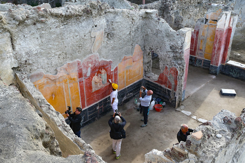 庞贝古城精美壁画遗迹出土 工作人员展开修复