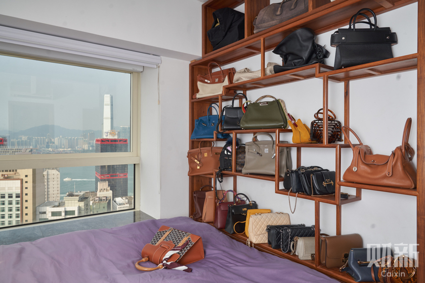 9月14日,香港上环荷里活道,一个面海的房间。房主将买来的名牌手袋放满了一面墙。因历史悠久,交通便利,酒吧、西餐厅聚集,该区吸引了大批来港工作的外国人居住。该楼盘今年的平均成交价约为1257万港币。美国物业顾问机构Demographia2018年1月发布,截至2017年三季度,香港住宅楼价中位数为619.2万港币,家庭年收入中位数31.9万港币,两者相除,得出楼价负担倍数为19.4,相当于一个普通香港家庭,不吃不喝19年才能完成供房。